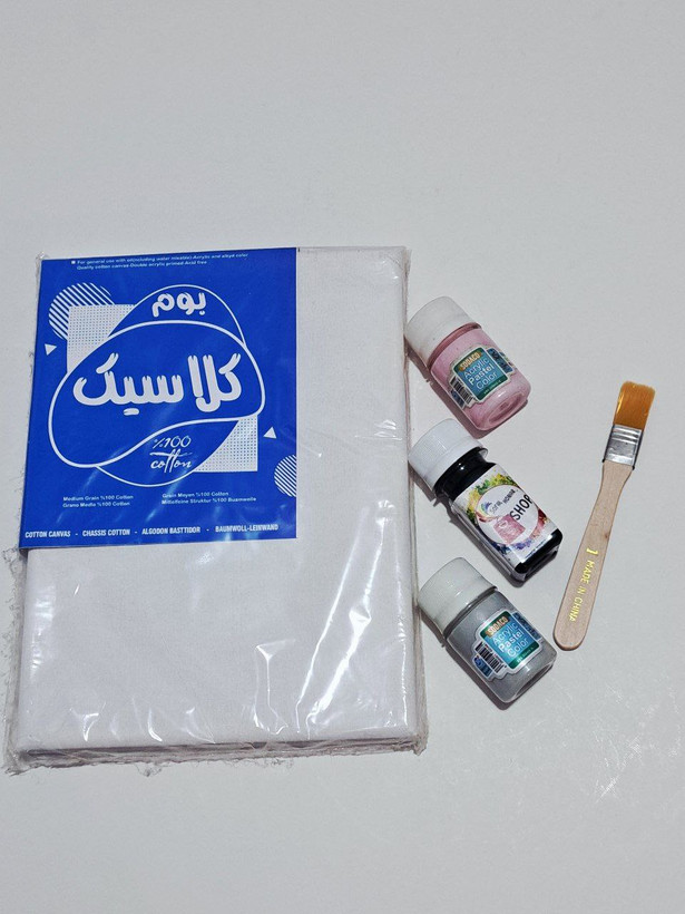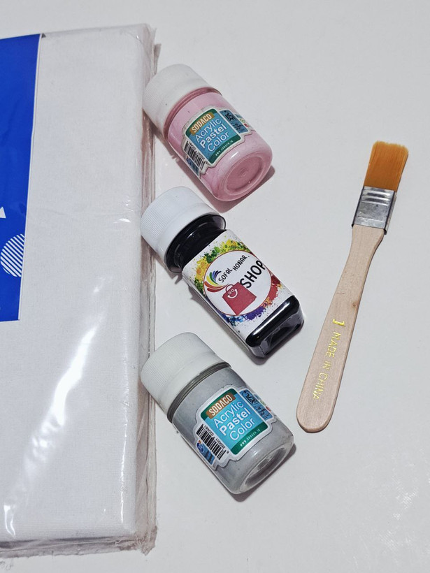 ✅️پک دیت اثر عشقِ ماندگار شامل ۳عدد رنگ اکریلیک۳۰میل سوداکو (طوسی و صورتی پاستلی و مشکی ۵۰ میل) ، ۱عدد بوم سایز ۲۴ * ۱۸، قلمو زمینه ۱