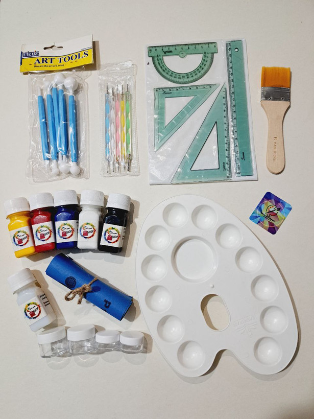 لوازم این پک شامل: ۵ عدد رنگ اصلی اکریلیک هنری هر عدد ۴۰ میل،۵ عدد قلم داتینگ پک ۵عددی،سمبه ۵عددی پلاستیکی پک ۵عددی ،پک خطکش گونیا نقاله ،سنباده،قلمو زمینه سایز ۶ ،پالت تخم مرغی،سنباده آ۴، وارنیش پایه آب وستا ۴۰میل( تثبیت کننده و براق کنند)،۴عدد قوطی نگهدارنده ۱۰گرم و ۵گرم
